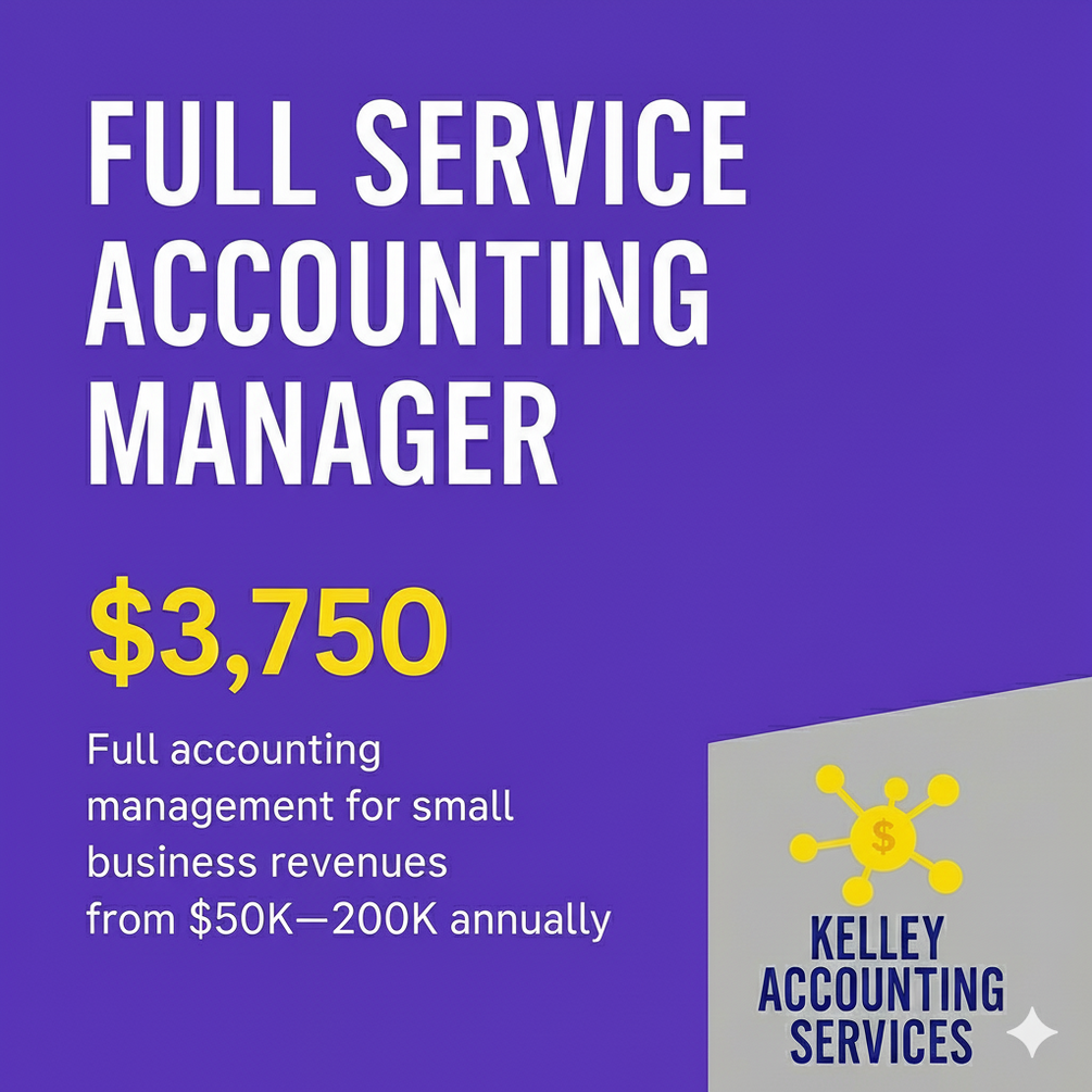 Full-service accounting for growing small businesses earning $50K–$200K annually. Kelley Accounting Services provides expert bookkeeping, reconciliations, financial reporting, and forecasting for $3,750/month. Gain clarity, save time, and get CPA-ready statements every month. We Get It Done.
