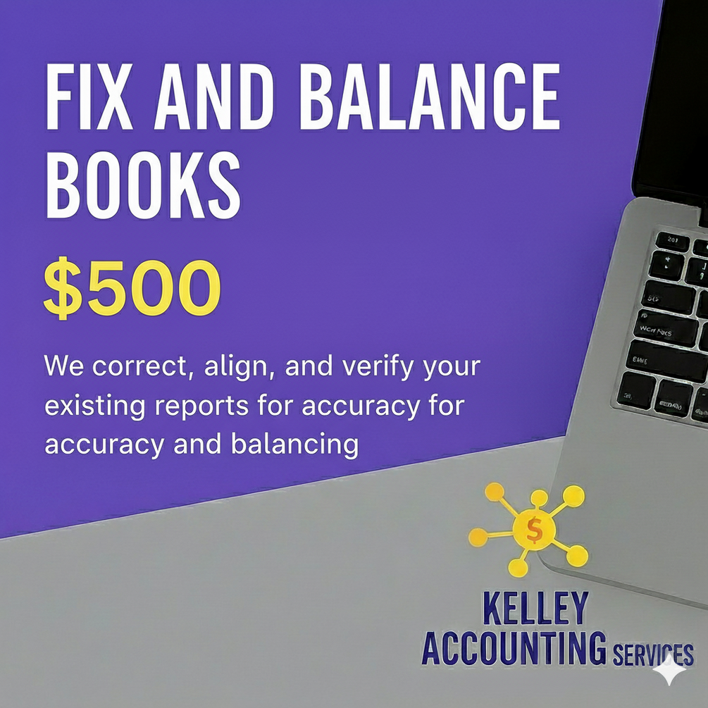 Professional bookkeeping correction and balancing service. Kelley Accounting Services reviews and fixes inaccurate reports to ensure clean, reconciled, and CPA-ready financials for $500. Delivered in PDF format. Old reports required for review. We Get It Done.